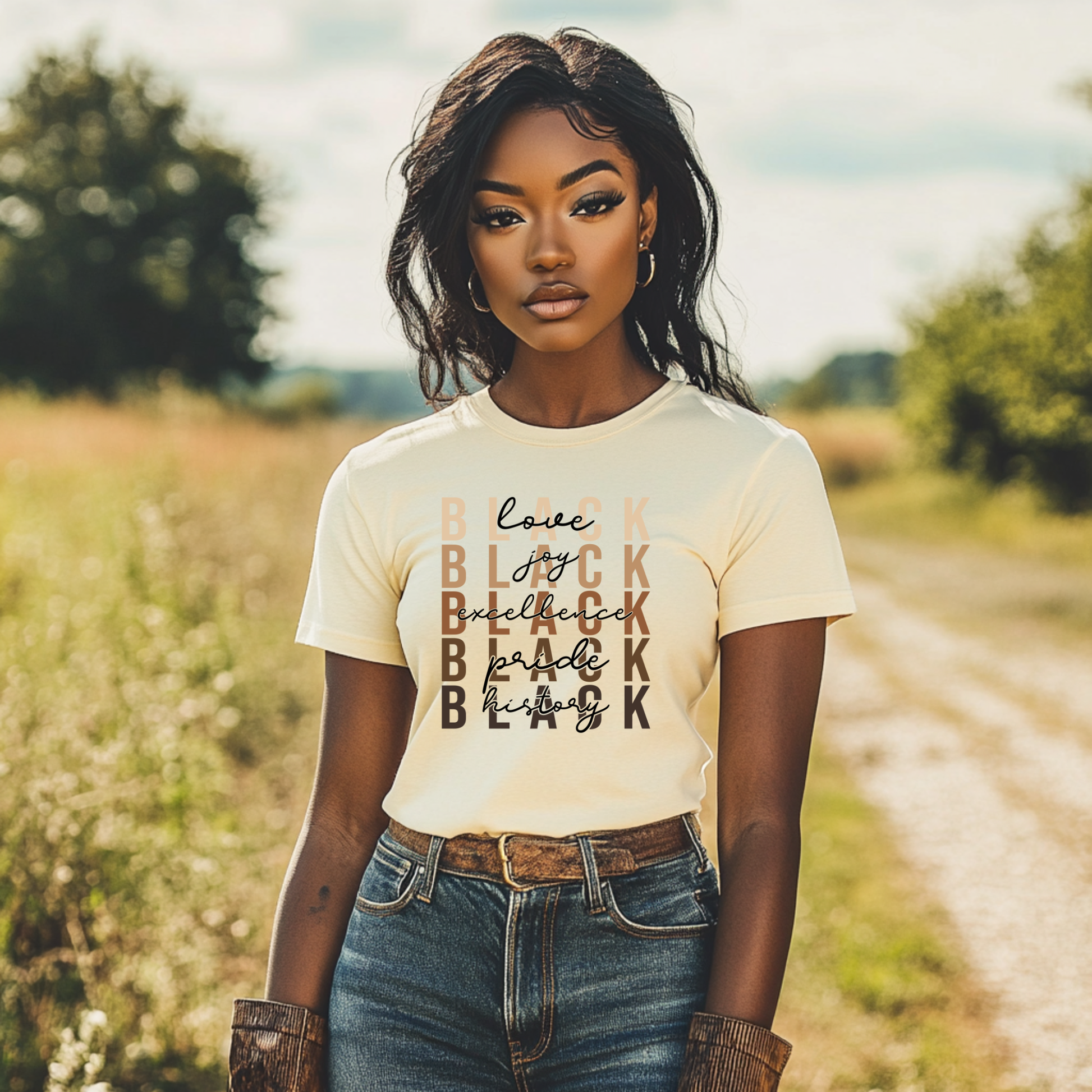 Celebrate heritage, pride, and excellence with our "Black Love, Joy, Excellence, Pride, and History" T-shirt. Designed to make a statement, this premium tee is crafted from soft, breathable cotton, ensuring all-day comfort and durability. The stylish design features bold typography that highlights key values of Black culture, making it the perfect addition to your wardrobe. Whether you're attending cultural events, casual outings, or simply expressing your pride, this T-shirt offers versatility and style. Show the world what Black excellence truly means and wear your pride with confidence. Ideal for gifting or treating yourself, this shirt is more than just fashion—it's a movement.