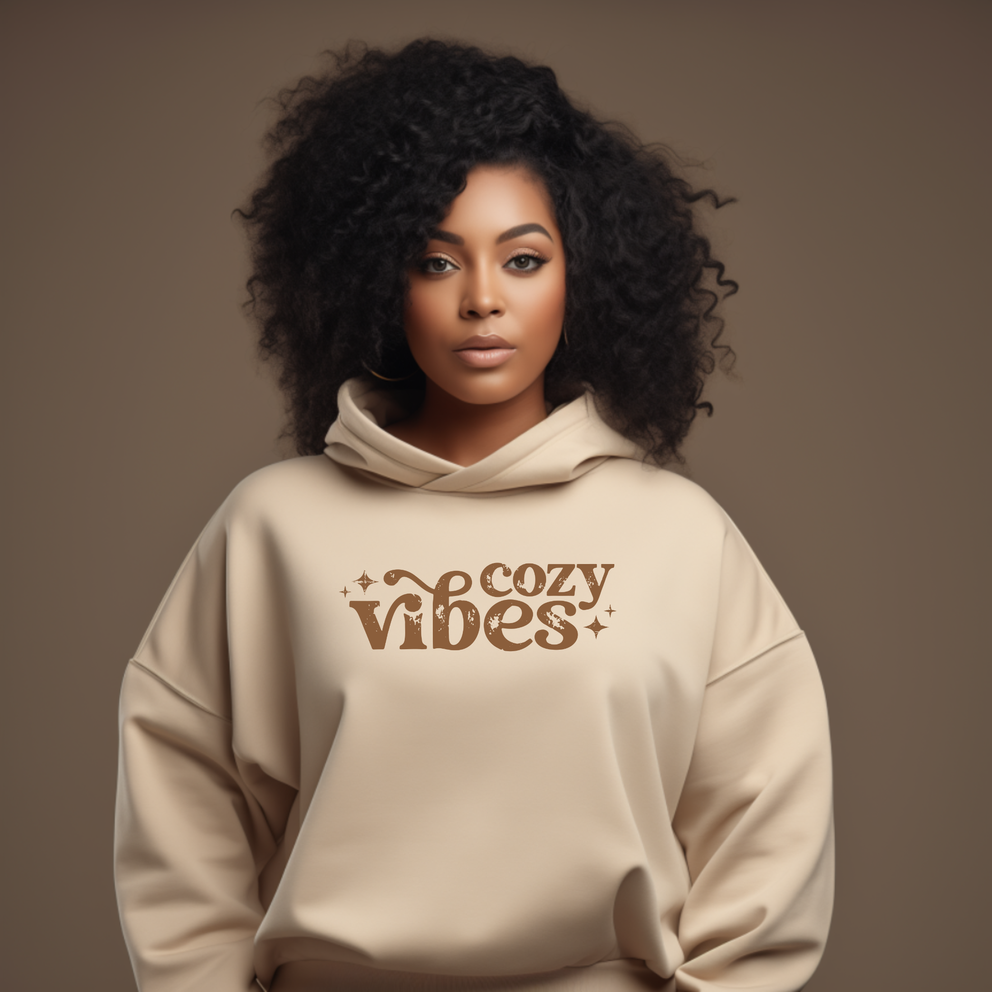 Featuring a distressed style “Cozy Vibes” graphic in a neutral, earthy tone, this design pairs beautifully with any season. Its versatile fit and soft feel make it ideal for layering or wearing solo—no matter if you choose a t-shirt, sweatshirt, or hoodie.
