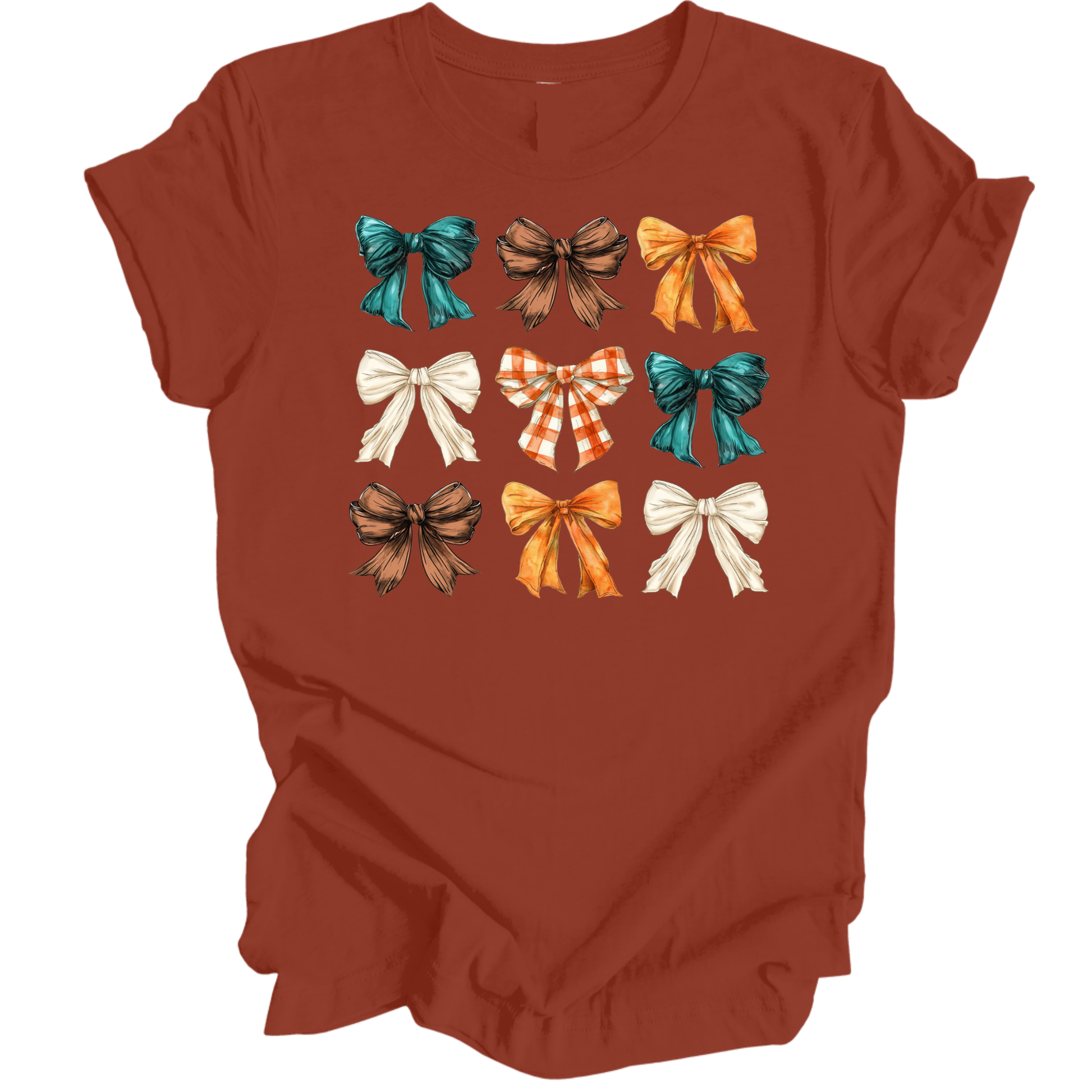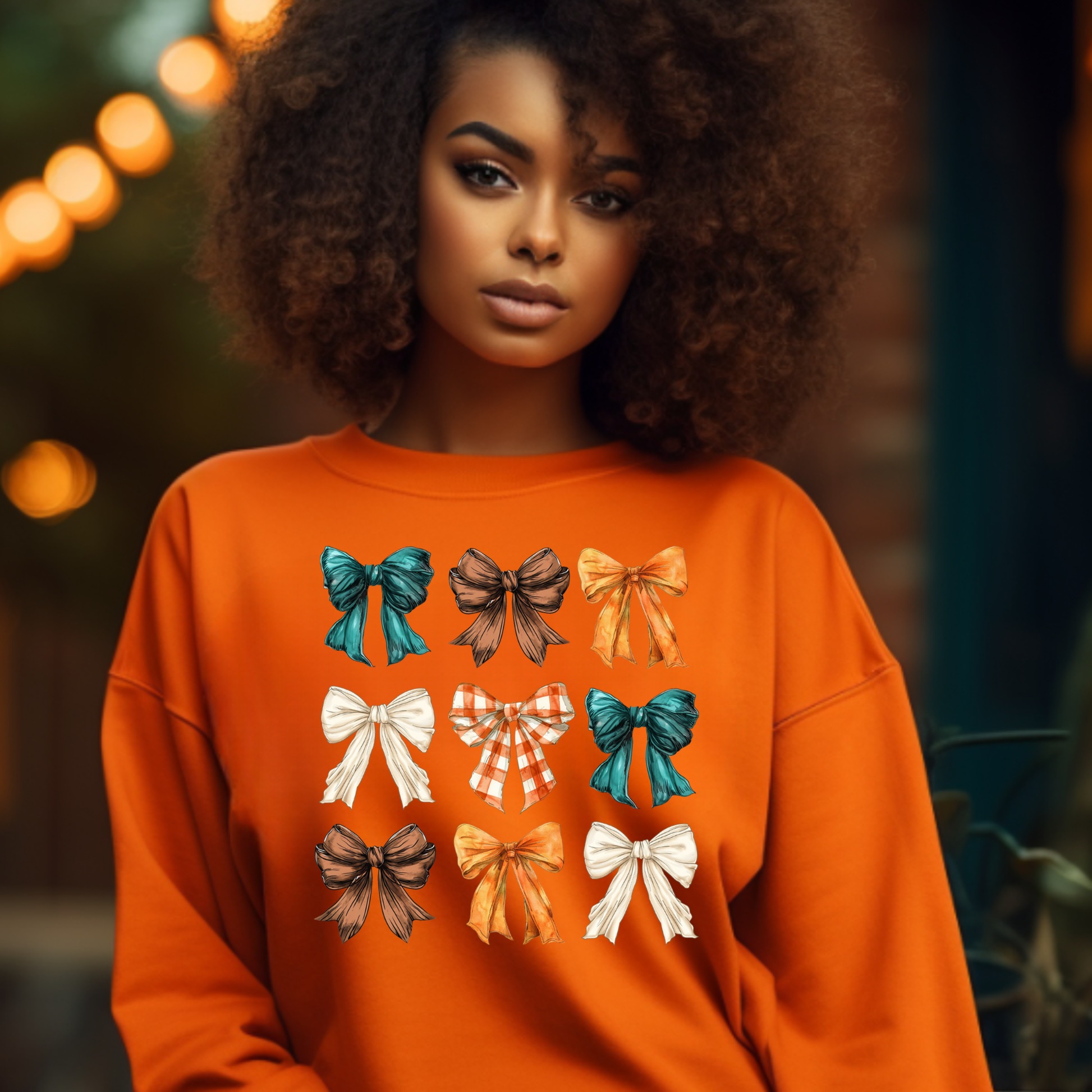 Turn heads this season with our Fall Coquette Bows tee, featuring a charming grid of hand-drawn bows in cozy autumn shades—teal, cream, plaid, orange, and espresso brown. Perfect for lovers of soft girl vibes, coquette aesthetics, and all things fall, this design brings a playful yet polished twist to your wardrobe.