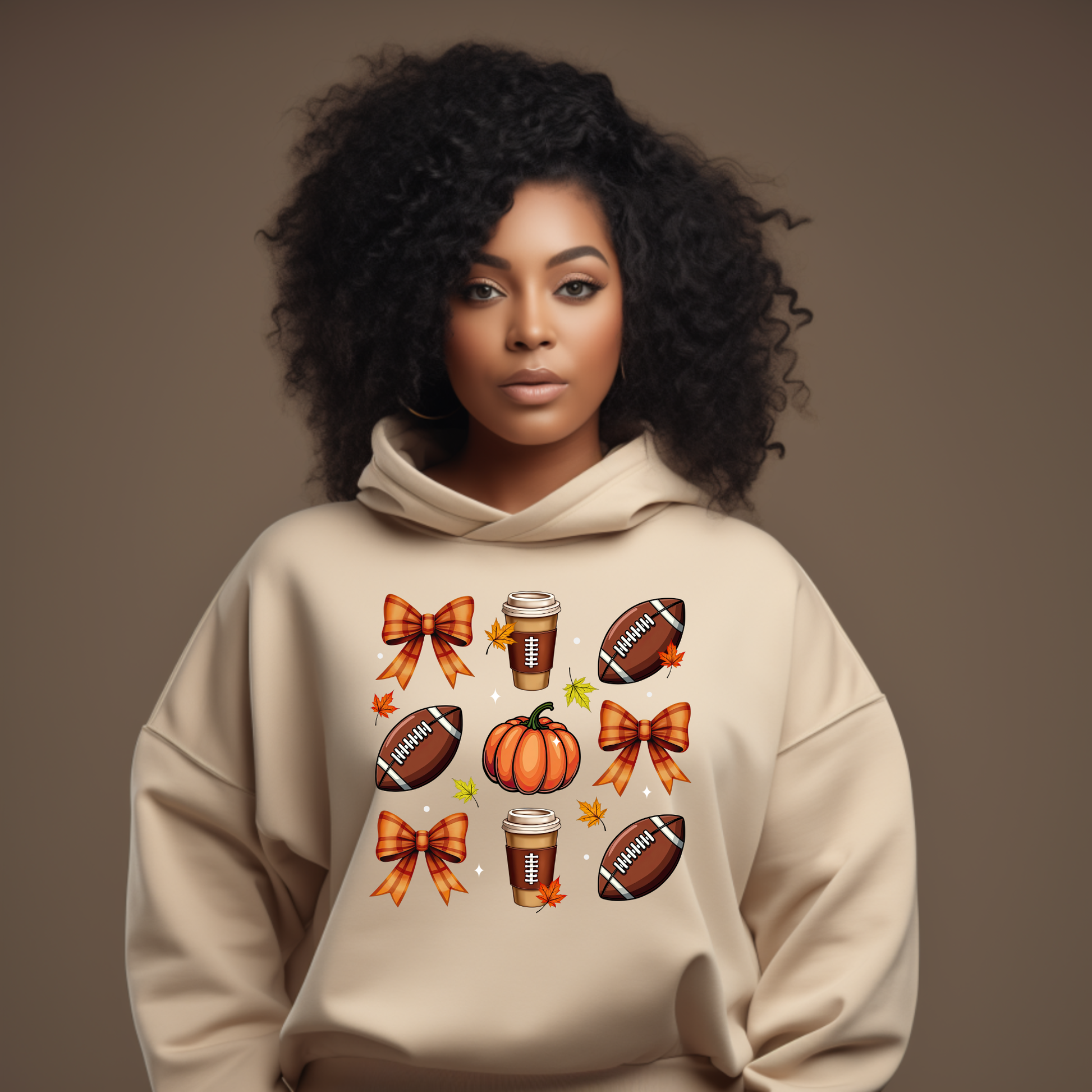 Embrace everything you love about fall in one bold, cozy statement tee! 🍂🏈 Our Fall Vibes T-shirt features a playful mix of autumn essentials—football, pumpkin spice lattes, plaid bows, and crunchy leaves—all in warm, seasonal tones. Whether you're tailgating, pumpkin patch hopping, or sipping cider with friends, this shirt brings all your favorite fall moments to life.