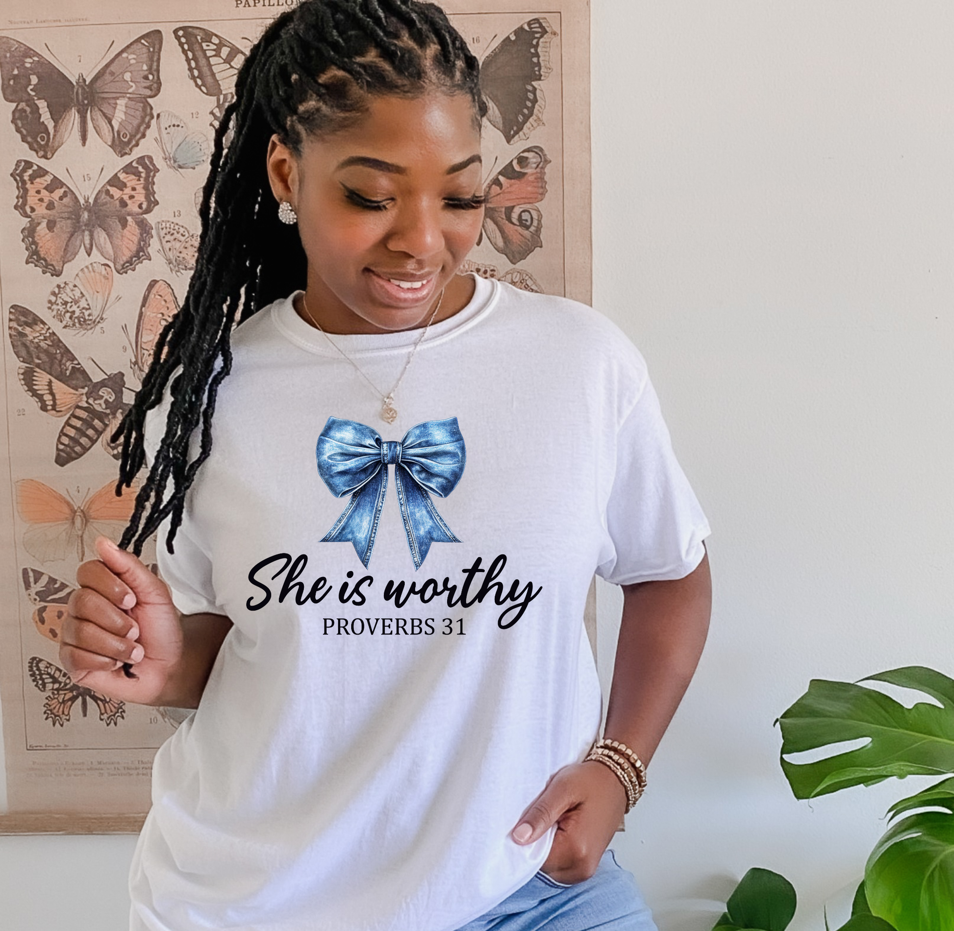 Celebrate your worth with the 'She is Worthy' t-shirt, inspired by the virtuous woman of Proverbs 31. This elegant white tee features a striking blue bow graphic, symbolizing dignity and strength.